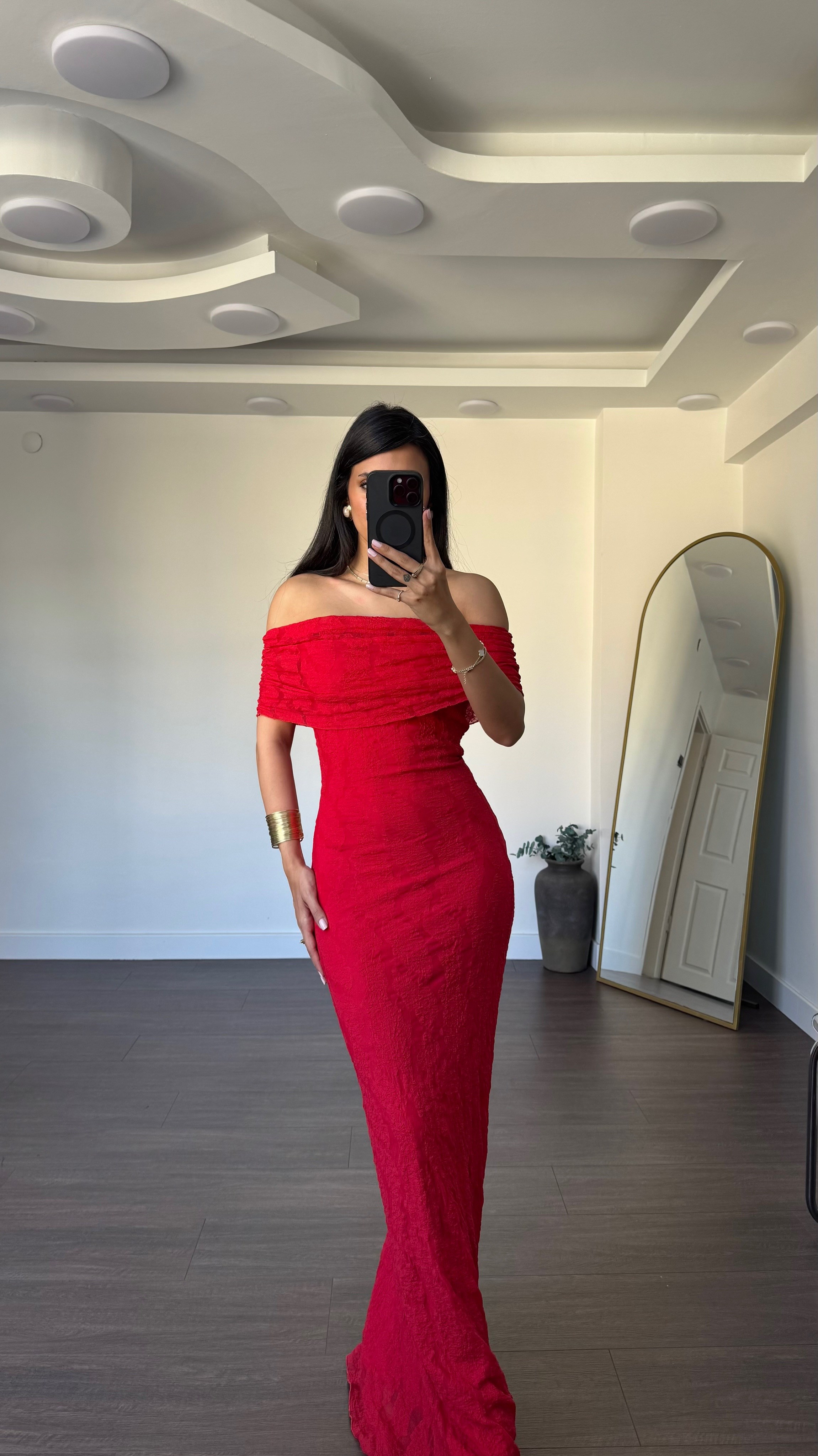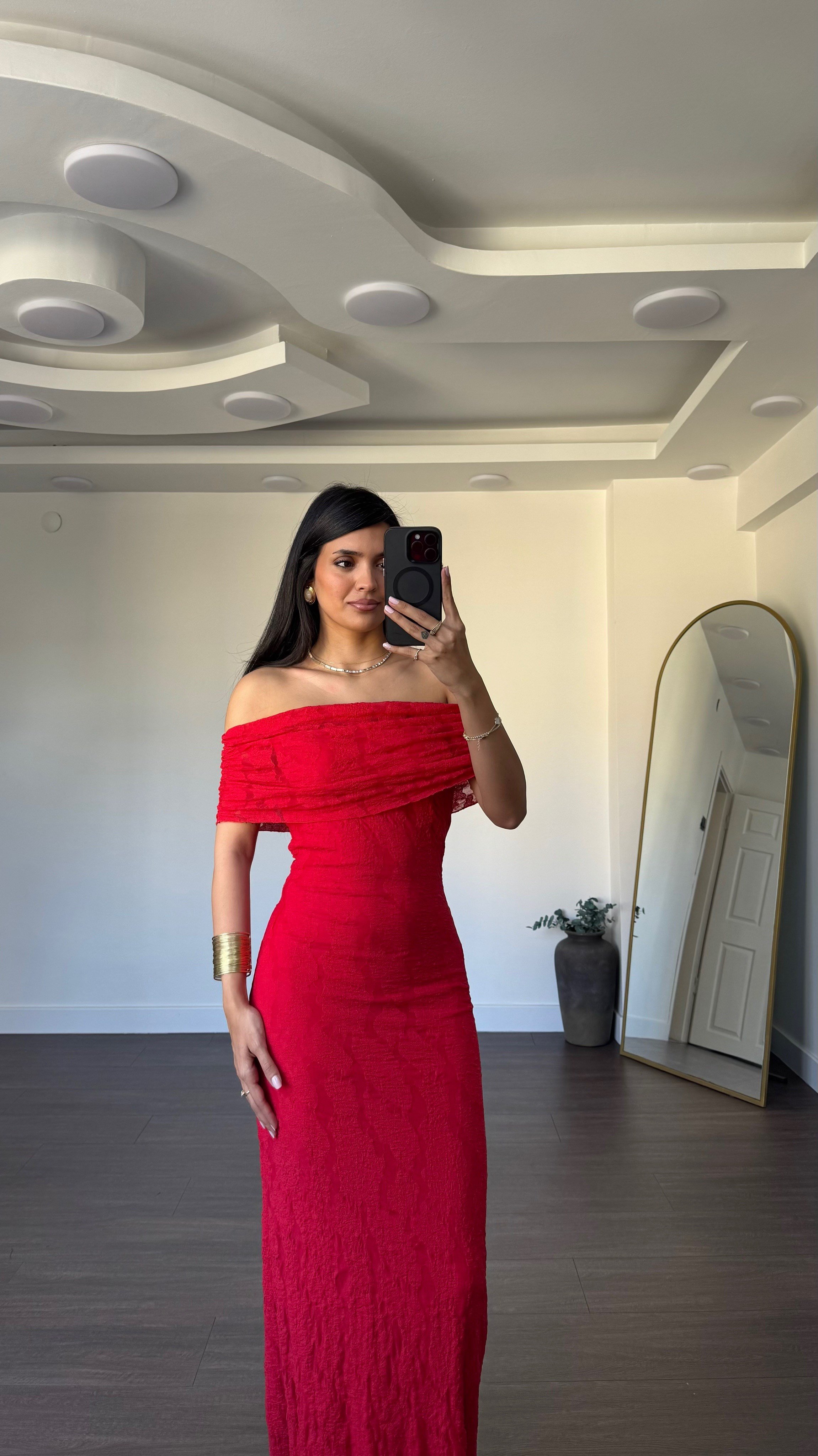 Madonna Yaka Dantel Detay Elbise-Kırmızı