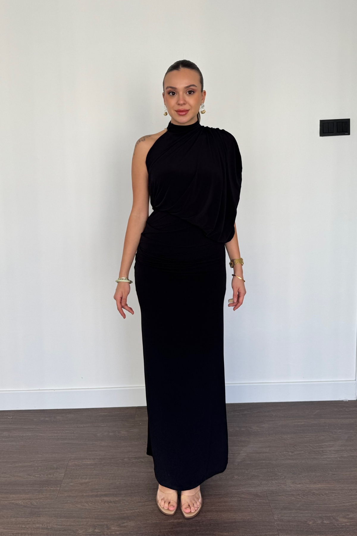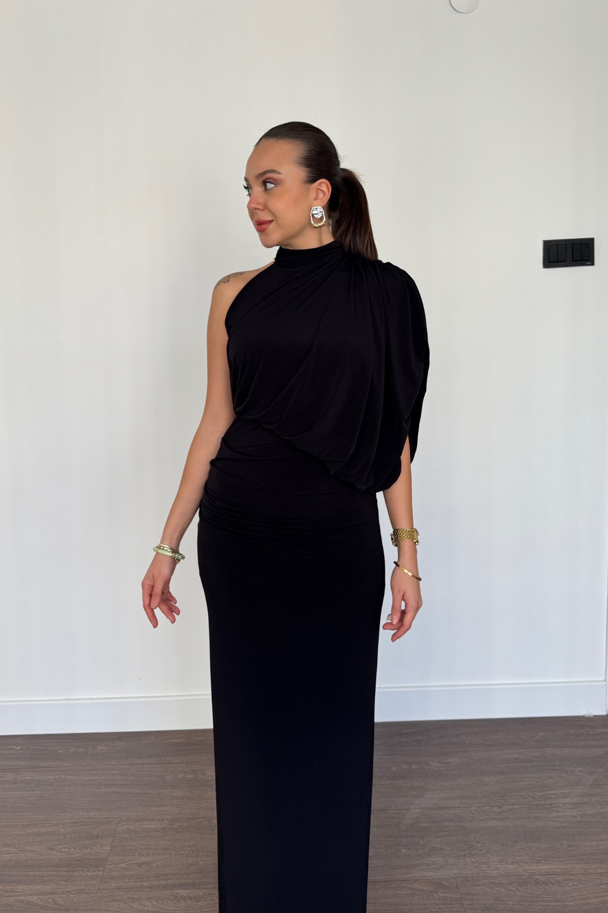 Tek Omuz Drape Detaylı Elbise-Siyah
